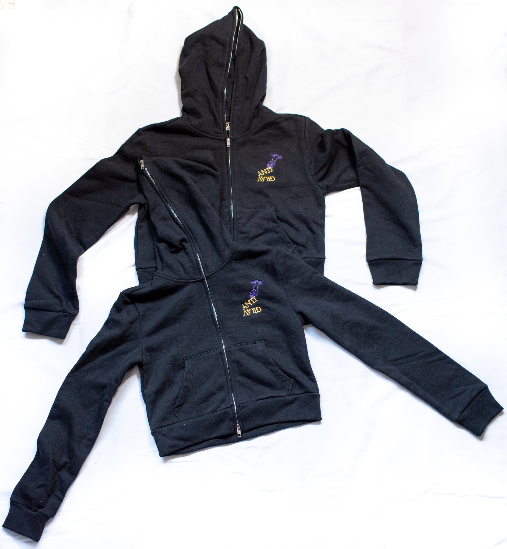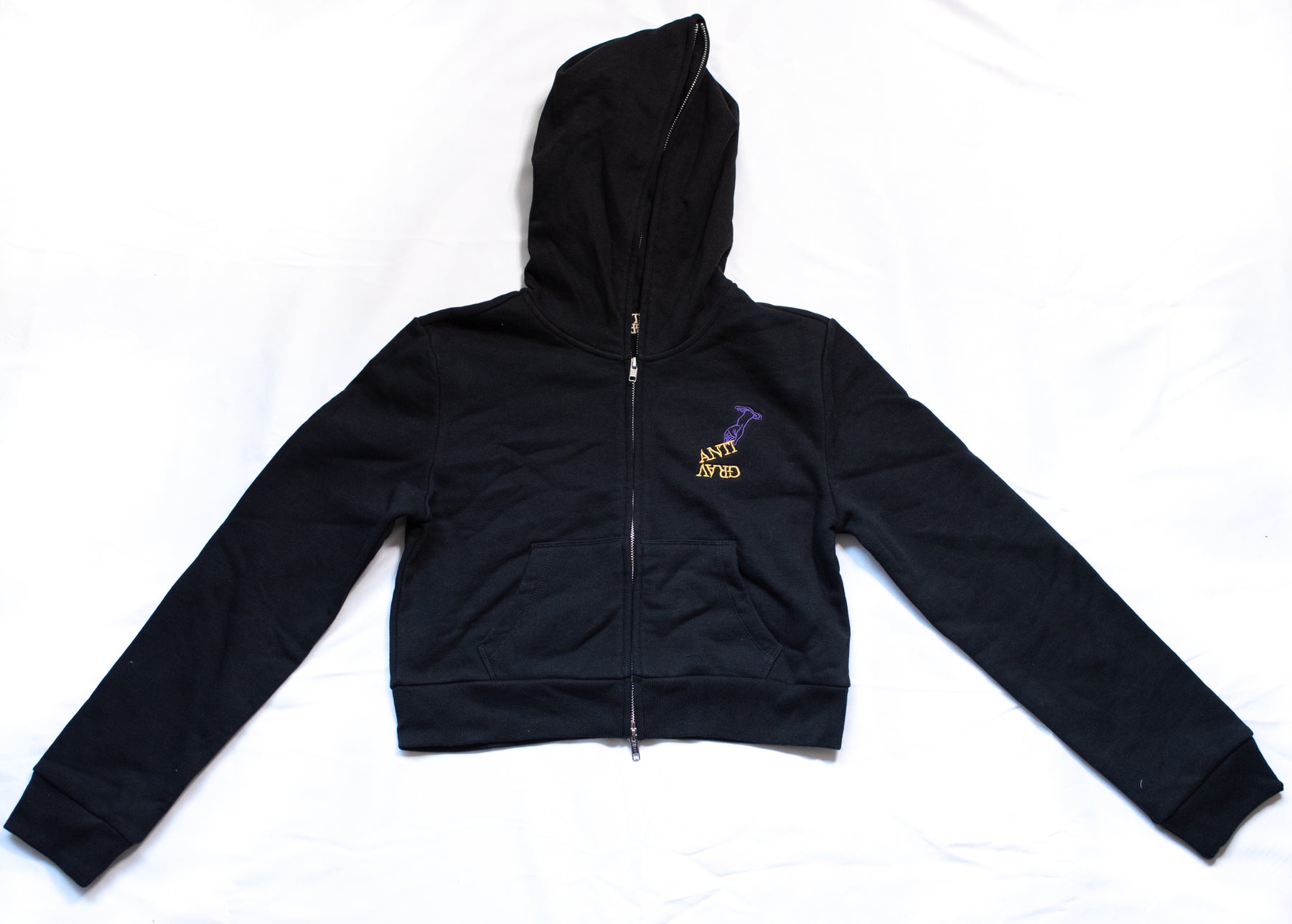 Custom-dyed purple and cropped options with ANTIGRAV embroidery.